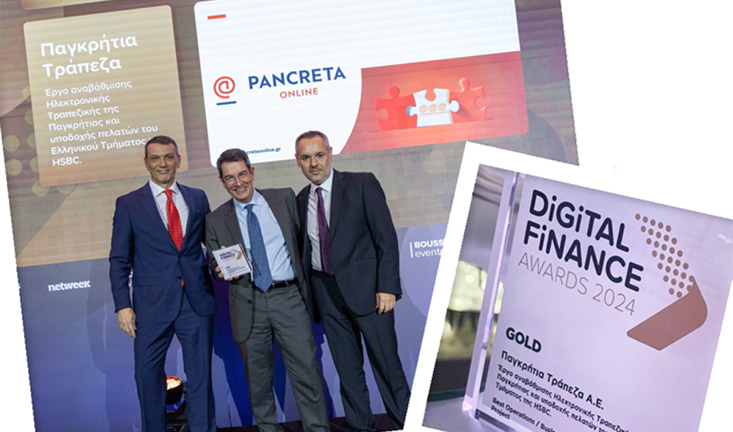 Το Χρυσό Βραβείο στην κατηγορία “Process & Technology - Best Operations / Business Process / Agile Development Project” απέσπασε η Παγκρήτια Τράπεζα στα φετινά Digital Finance Awards.