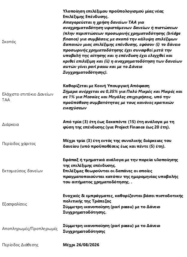 Τα δάνεια του ΤΑΑ δύναται να χορηγηθούν με πολύ χαμηλό επιτόκιο (ευνοϊκότερο των κρατούντων στην τραπεζική αγορά για ανάλογες περιπτώσεις επενδυτικών σχεδίων), γι’ αυτό τον λόγο πρέπει να εξεταστεί η συμβατότητα με τους κανόνες κρατικών ενισχύσεων. Εάν το επιτόκιο του δανείου ΤΑΑ είναι μικρότερο από το επιτόκιο αναφοράς (reference rate) που προκύπτει για την επιχείρηση βάσει της πιστοληπτικής της διαβάθμισης και των ειδικότερων χαρακτηριστικών του εγκεκριμένου δανείου (ποσό, εξασφαλίσεις), τότε η διαφορά των εν λόγω επιτοκίων για το δάνειο ΤΑΑ αποτελεί κρατική ενίσχυση και εφαρμόζονται τα οριζόμενα στους Καν. (ΕΕ) 651/14 (ΓΑΚ), όπως τροποποιήθηκε με τον Καν. (ΕΕ) 1315/2023, ή τον Καν. (ΕΕ) 2831/2023 (De minimis), ή τον Καν. (ΕΕ) 2472/2022 (Αγροτικός Απαλλακτικός Κανονισμός), ανάλογα με την επιλογή του καθεστώτος κρατικών ενισχύσεων του επενδυτή.